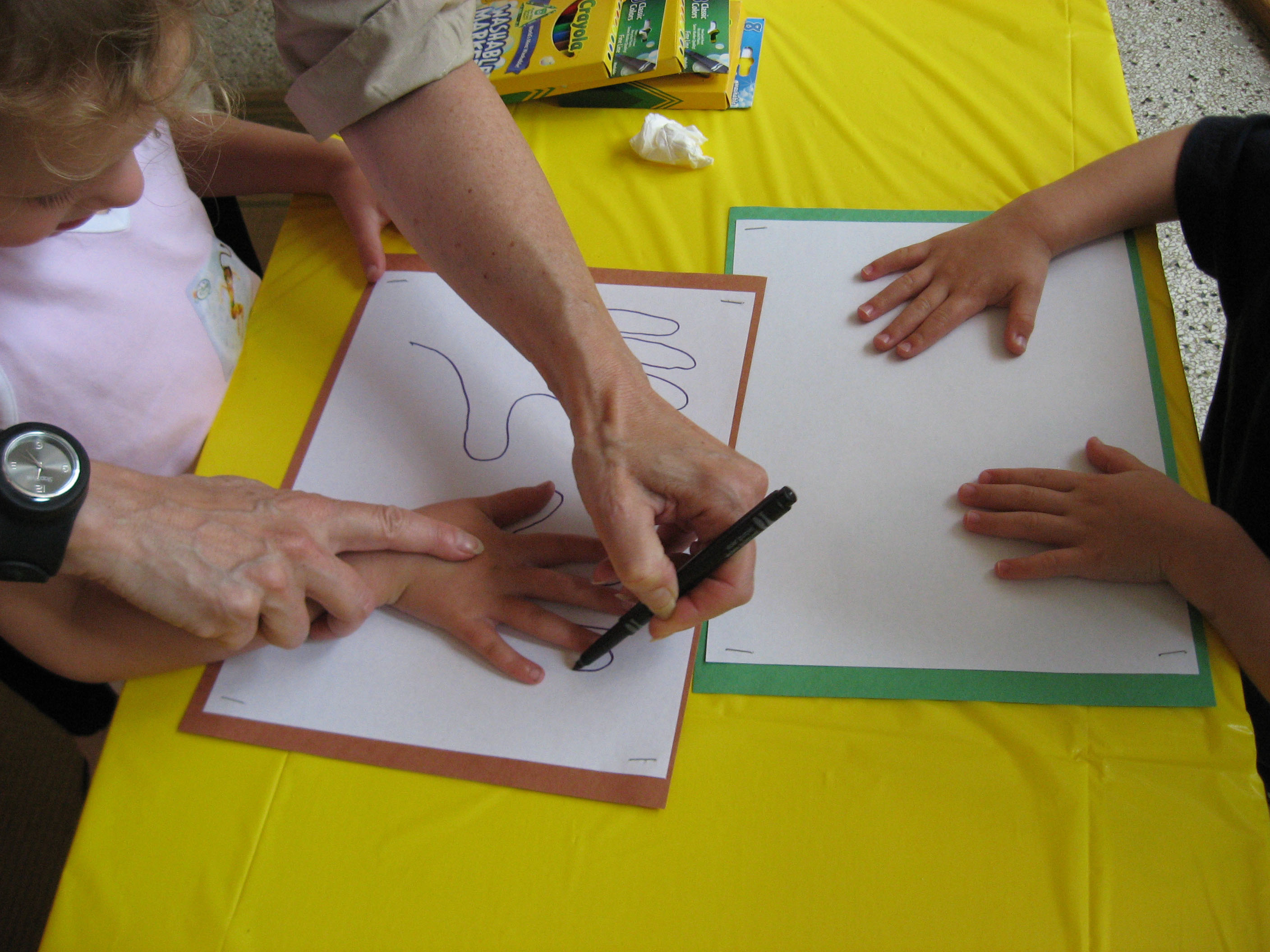 1. Have the children place their hands on the paper.  Draw the outline of their handprints.