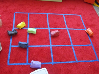 I couldn’t find a picture of bean bags decorated like soccer balls, but it wouldn’t be difficult to use black marker or crayons on a white lunch bag. And filling them with socks instead of beans would be fun for kids to do.