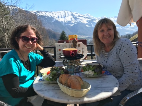 Viv and Julie having fondue at Chateau Gruyere Published December 7, 2019 at 480 × 360 in 2019: A Look Back – A Look Ahead – A Book Blog Tour – And More At a Fondue restaurant in Gruyere with Julie Abery
