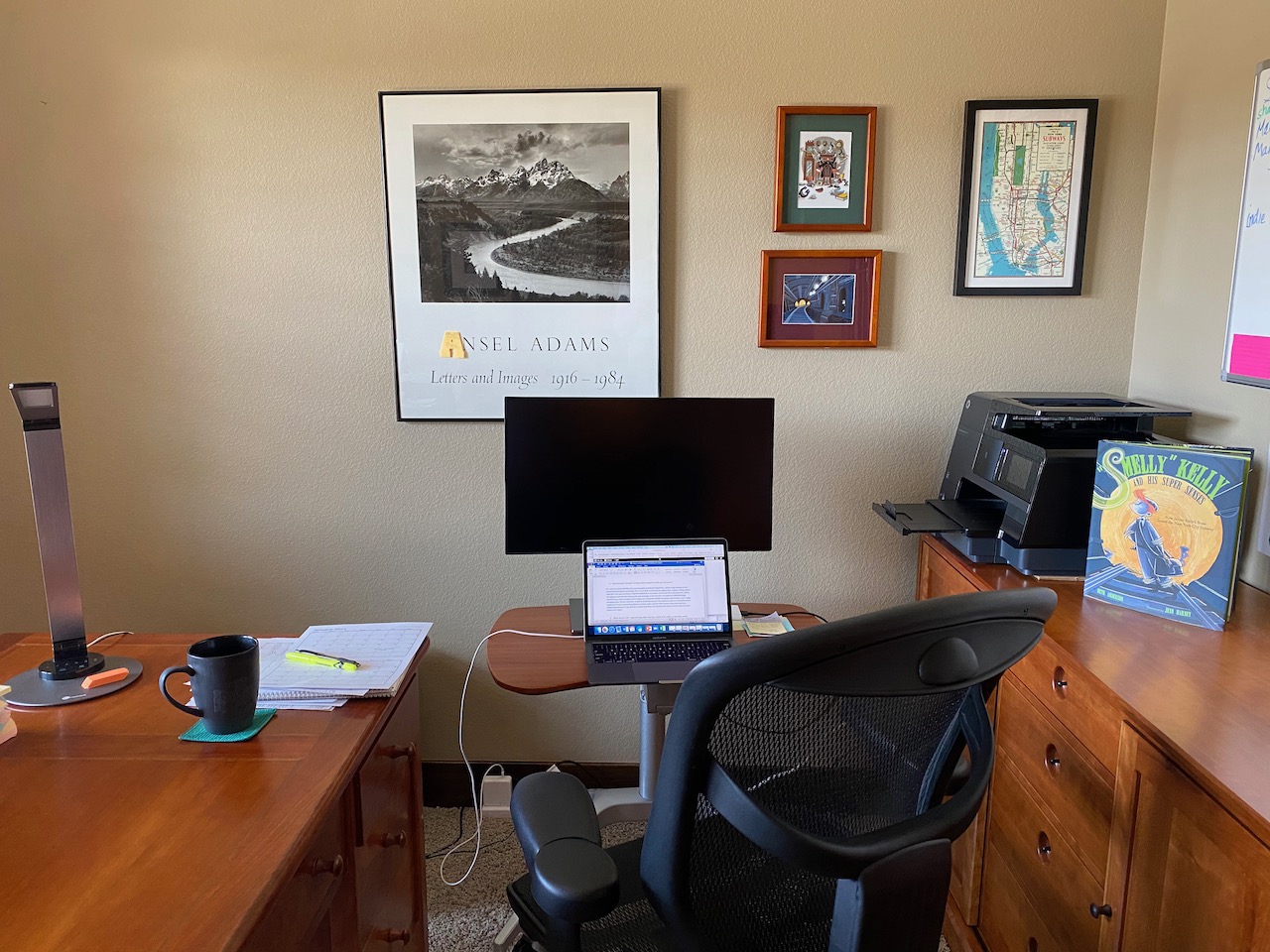 BETH: As I came to realize that this crazy journey might actually be happening, I slowly made changes to the study to accommodate my writing. First, in an effort to improve ergonomics, I added a rolling laptop desk that I can raise and lower to get the keyboard at the proper level. Now, this is also great for raising the laptop to eye level for virtual visits and meetings. A year ago I added an additional large monitor to use with my laptop which allows me to spread multiple documents and windows over a large viewing surface. I absolutely love it and wish I had done that sooner! My husband made me a beautiful cherry credenza to house my growing collection of book stuff. I put the white board on the wall and have added a few favorite book related pictures. My writing space is now quite cozy and convenient, and I’m surrounded with all sorts of files and resources within arm’s reach.