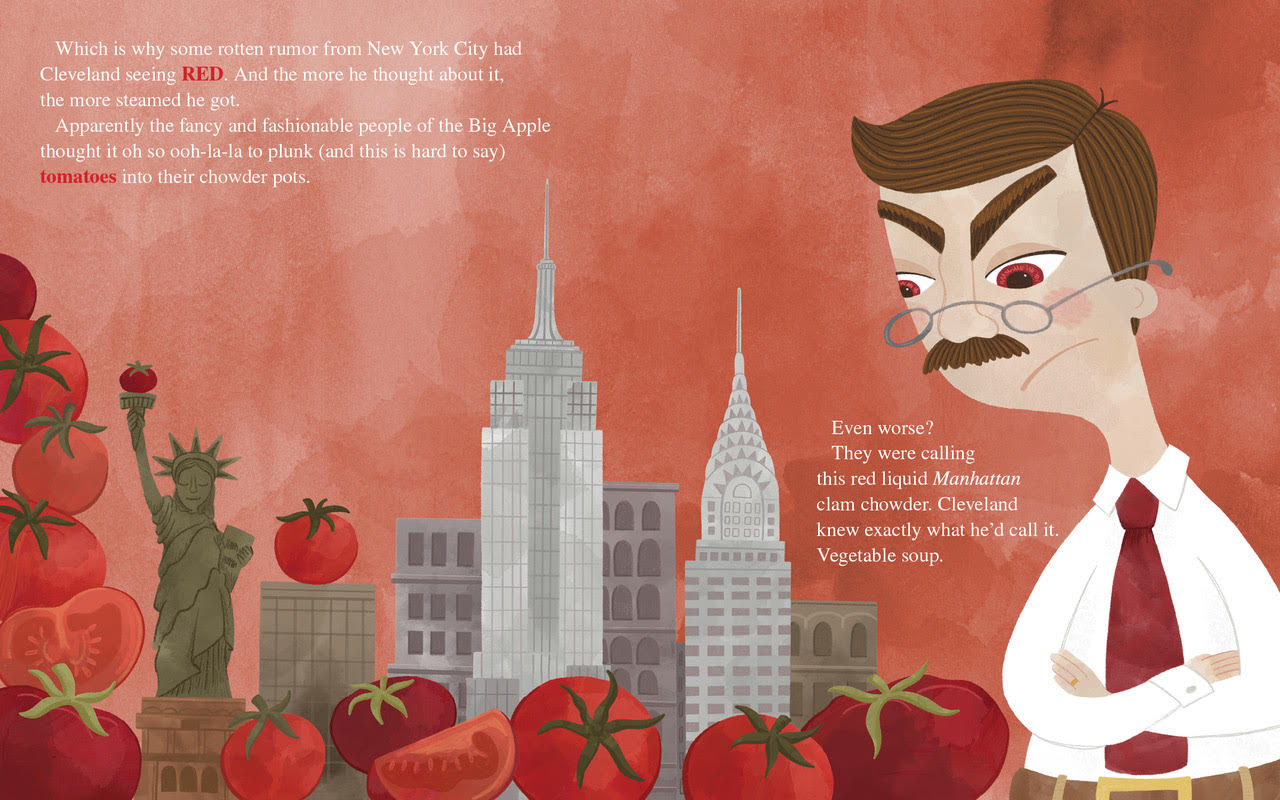 One of things that cracks me up about this book is what happens when I talk about it to other people. Usually when you mention you write books, people want to know what it’s like, what the process is, etc. As soon as I mention CHOWDER RULES! is a story about whether tomatoes should be legal in clam chowder? They tell me in the most passionate of terms where they stand on tomato vs. no tomato! I love it. This book strikes an intense culinary nerve which is also why I wanted to write about Cleveland Sleeper and his attempt to save Clam Chowder from becoming vegetable soup!