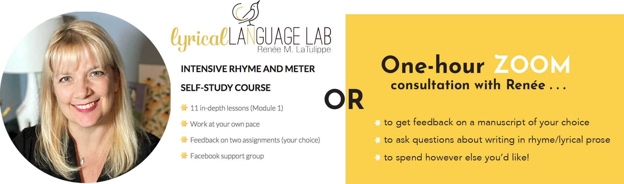 I took Renee’s regular Lyrical Language Lab course and it really helped me become a better writer. This self-study class is perfect for those who like to pace themselves.