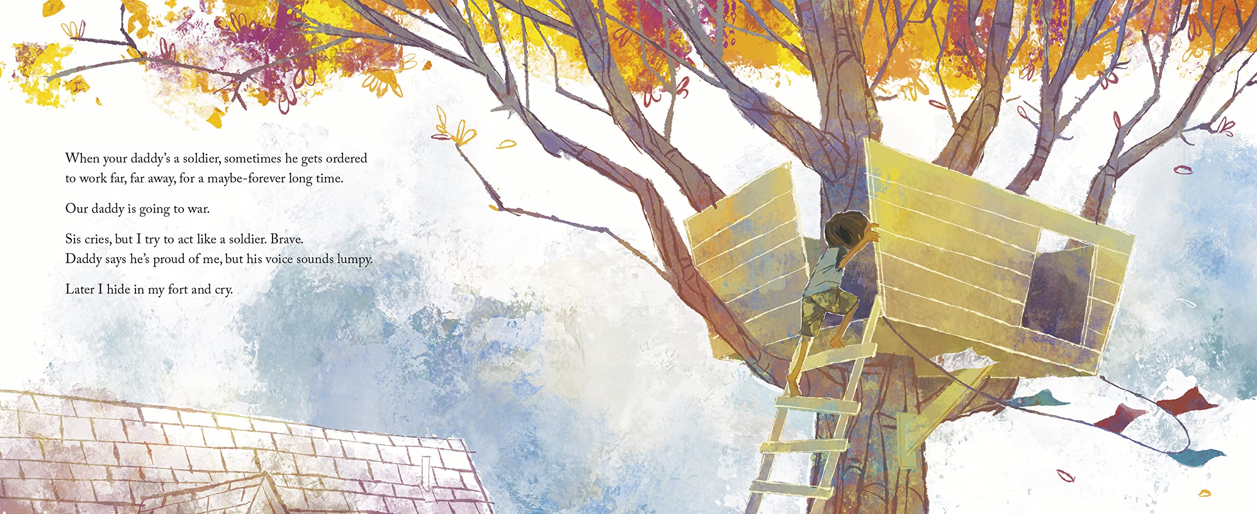 Thank you for sharing that kids on JBLM talked about their tree houses. EG Keller created such a beautiful tree fort for my story, and I love that he drew the daddy in it comforting his son. I imagine some of the tree houses your students talked about were ones they’d had to leave behind or would with their next PCS. As you know, there are so many kinds of goodbyes in the military life.