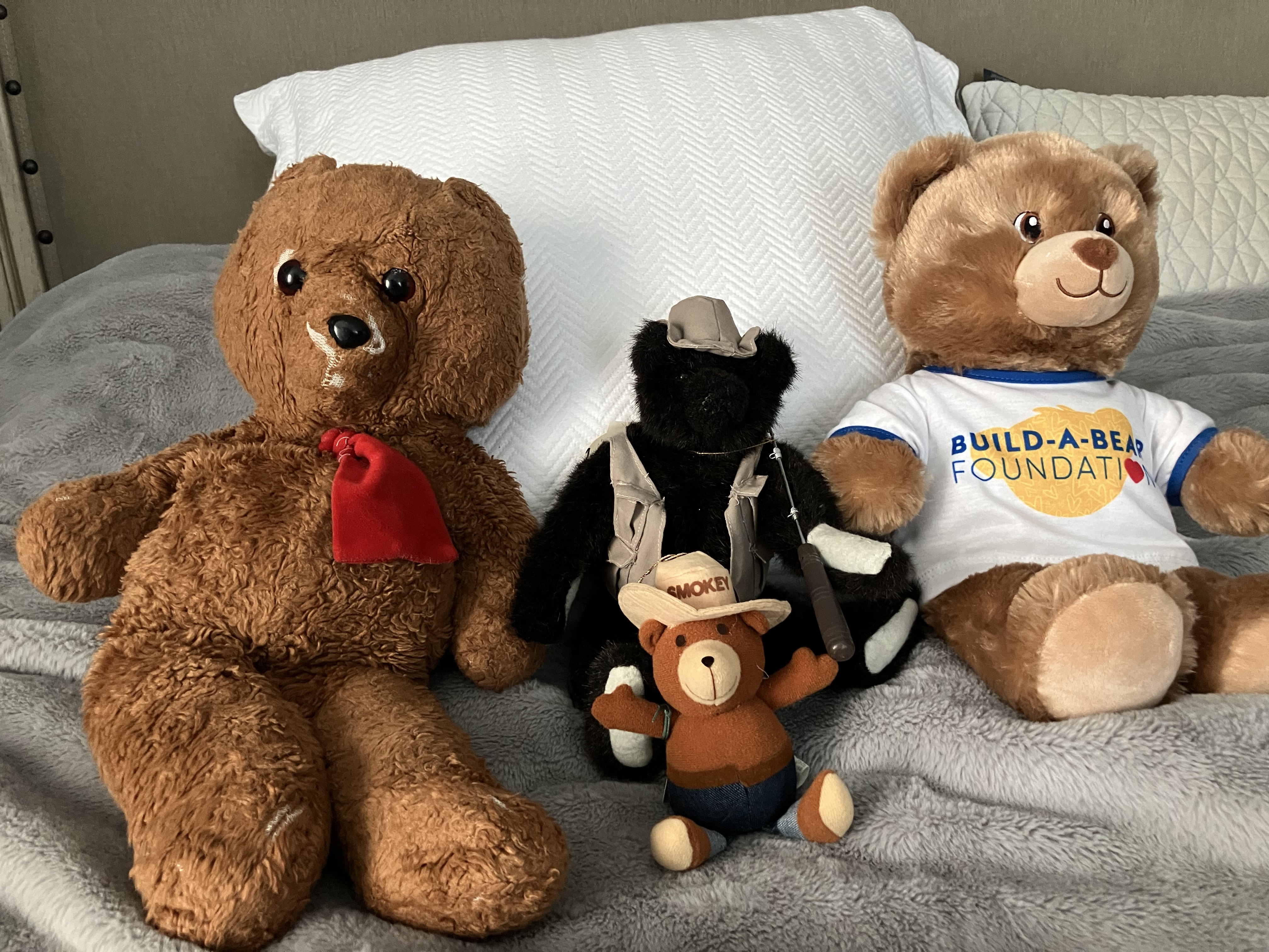 Four beloved teddy bears in the Kirkfield home: from left to right – Honey Jo (bought for my daughter in 1980 when she was just a baby – and she still treasures it); Fisherman Bear (bought by my son for his dad in 1998 because my husband was an avid fly fisherman), little Smokey Bear (bought in 1985 when we took our kids to a Fire Prevention Week local firehouse tour), and Build-A-Bear (acquired last November at the NCTE conference). .