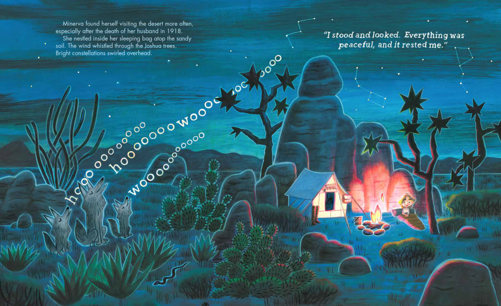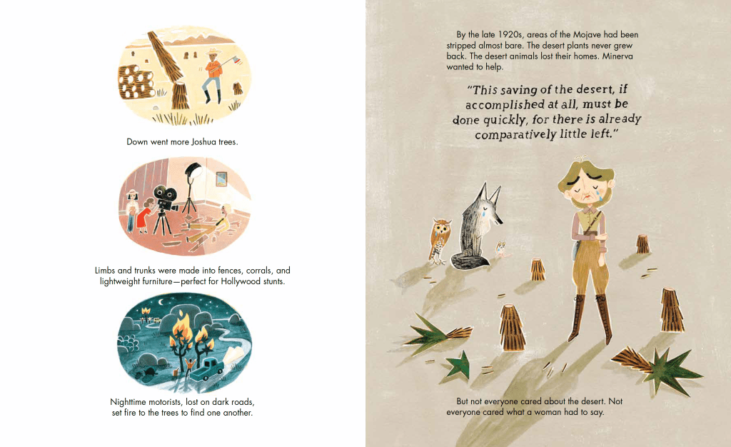 LORI: Discovering a lesser-known historical figure can be quite a treat for a nonfiction picture book author. When I learned about Minerva Hoyt’s unusual means to garner attention for her cause—protecting her favorite spot, the Joshua tree region of the Mojave desert—I knew this was a story kids would love.