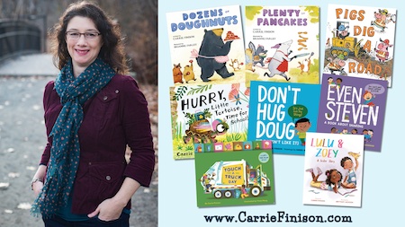 Carrie Finison writes children’s books with humor and heart that are fun to read aloud. Her books include Dozens of Doughnuts and the sequel, Plenty of Pancakes; Don’t Hug Doug, an ALA Notable Children’s Book; Even Steven: A Book About Sharing; Lulu & Zoey: A Sister Story; Hurry, Little Tortoise, Time for School; Pigs Dig a Road; and Touch a Truck Day, a lift-the-flap board book. She lives outside of Boston with her husband, son, and daughter, and two cats who permit her to work in their cozy attic office.
