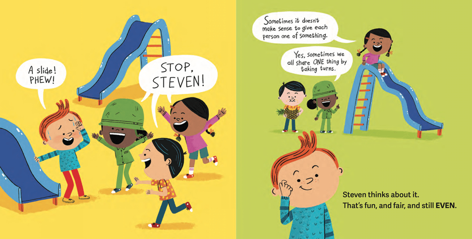 The inspiration for Even Steven: A Book About Sharing might have (/PROBABLY DID) come from my children literally using our kitchen scale to weigh out brownies, using tape to make a dividing line exactly in the middle of their seats in the car, and using a timer to make sure no one got more than their fair share of computer time. I’m sure most parents and anyone with a sibling is familiar with these scenarios. Kids love making sure things are even!