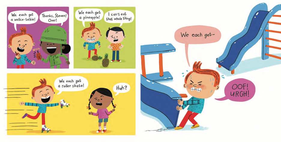 The format of dialogue balloons, paired with narrative text, enables both the characters in the book and the reader to acknowledge the humor and silliness of the situations that Steven creates with his insistence on perfect evenness. Instead of the reader thinking, “I’m supposed to believe this?” the format places the reader and book on the same side, both saying, “Can you believe this kid?”